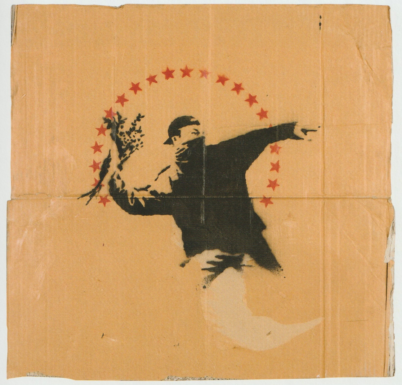 バンクシーの最も有名な作品の一つ、《Love Is In The Air》をモチーフにした作品。イスラエルとパレスチナを隔てる分離壁の建設を受けて制作された。バンクシー曰く、分離壁の建設により、「パレスチナは事実上、世界最大の屋外牢獄となった」。バンクシーがロンドンで初めて開催した展覧会「Turf War(ターフ・ウォー)」(2003年)でも話題を集めた。後に制作されたバリエーションはより巧妙に描かれているが、この作品の粗削りな表現は、ヨルダン側西岸の壁に最初にスプレーで描かれた当時のスピリットを生き生きと伝えている。