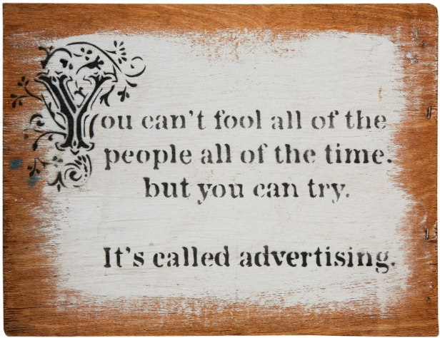 バンクシー作品の中には、絵ではなく言葉によって重要なメッセージを伝えているものがある。この作品には、「すべての人を常にだますことはできないが、だまそうとすることはできる。それが広告だ」と書かれている。これはエイブラハム・リンカーンの有名な言葉、「すべての人を一時的にだますことや、一部の人を常にだますことはできても、すべての人を常にだますことはできない」をもじったものだ。バンクシーは広告を忌み嫌い、折に触れて批判した。2004年の作品集『Cut It Out』にはこんな一文がある。「公共の場に掲げられた、見たくなくても目に入る広告は、あなたのものだ。取り外そうが、手を加えようが、再利用しようがかまわない。煮るなり焼くなりご自由に」。シーはこのうちの一枚を大英博物館に寄贈。偽紙幣は博物館のコレクションに加えられ、大英博物館が所蔵する初のバンクシー作品となった。