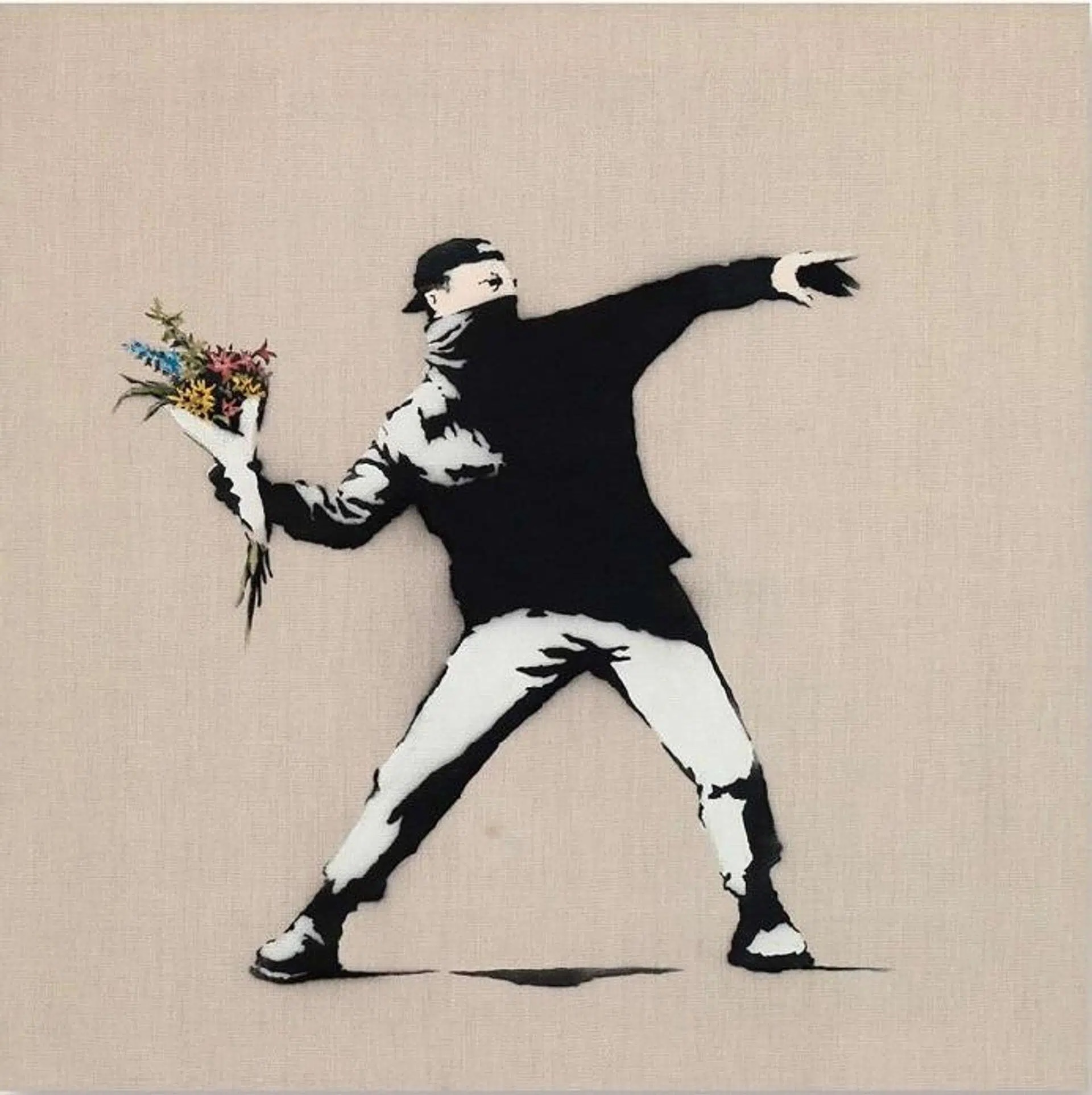 半世紀以上もイスラエル政府の占領下にあるパレスチナ。イスラエル軍の圧倒的な武力に対してパレスチナ市民が投石やゴムパチンコで対抗した抗議運動をモチーフに、男の手には石の代わりに花束を持たせたバンクシーの代表作。バンクシーの作家としての思想や活動家としての姿勢を象徴している。パレスチナのベツレヘム郊外のガソリンスタンドに描かれたグラフィティはいまも現存している。
