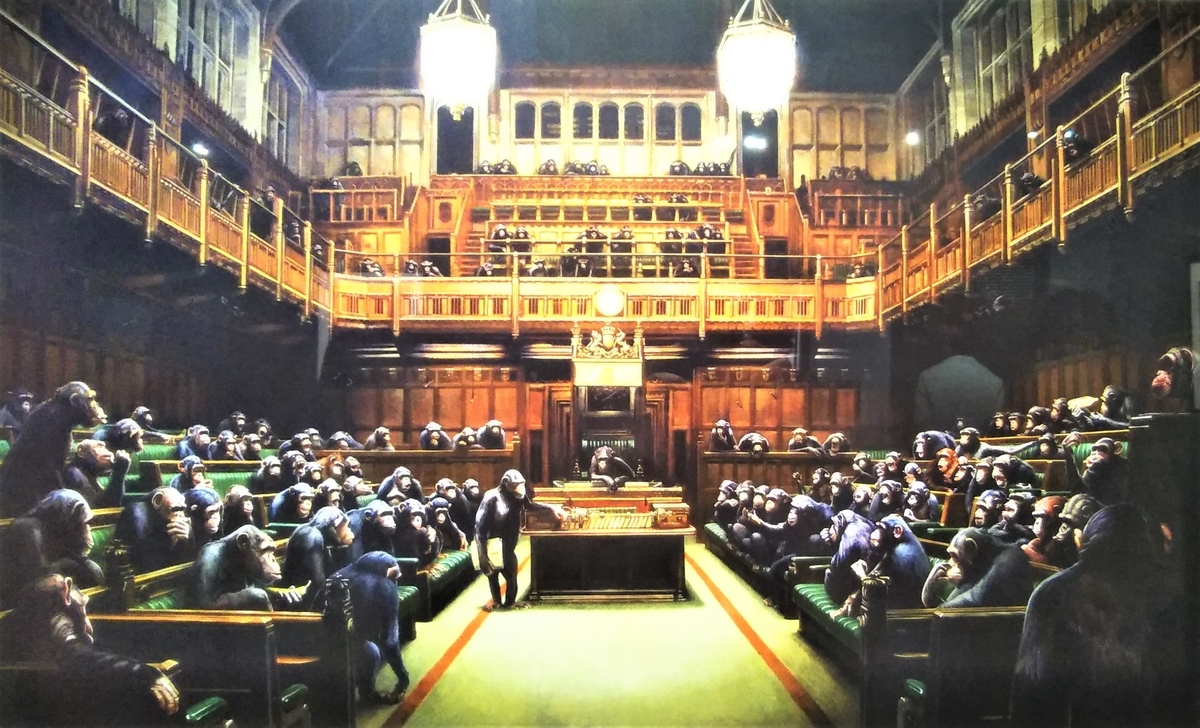チンパンジーに乗っ取られた議会は、かつて民主主義のモデルと讃えられたイギリス議会の凋落を描いている。横幅約4メートルのキャンバスに描かれた油彩画は、2009年にブリストル市立博物館・美術館で開催された企画展「Banksy vs Bristol Museum(バンクシーVSブリストル・ミュージアム)」で初公開された。本作はそのポスター版である。2019年には「ブレグジットで混迷するイギリス下院を予測していた」と話題を呼び、《Devolved Parliament》と改題された油彩画が同年10月にサザビーズのオークションに出品、約13億円で落札された。