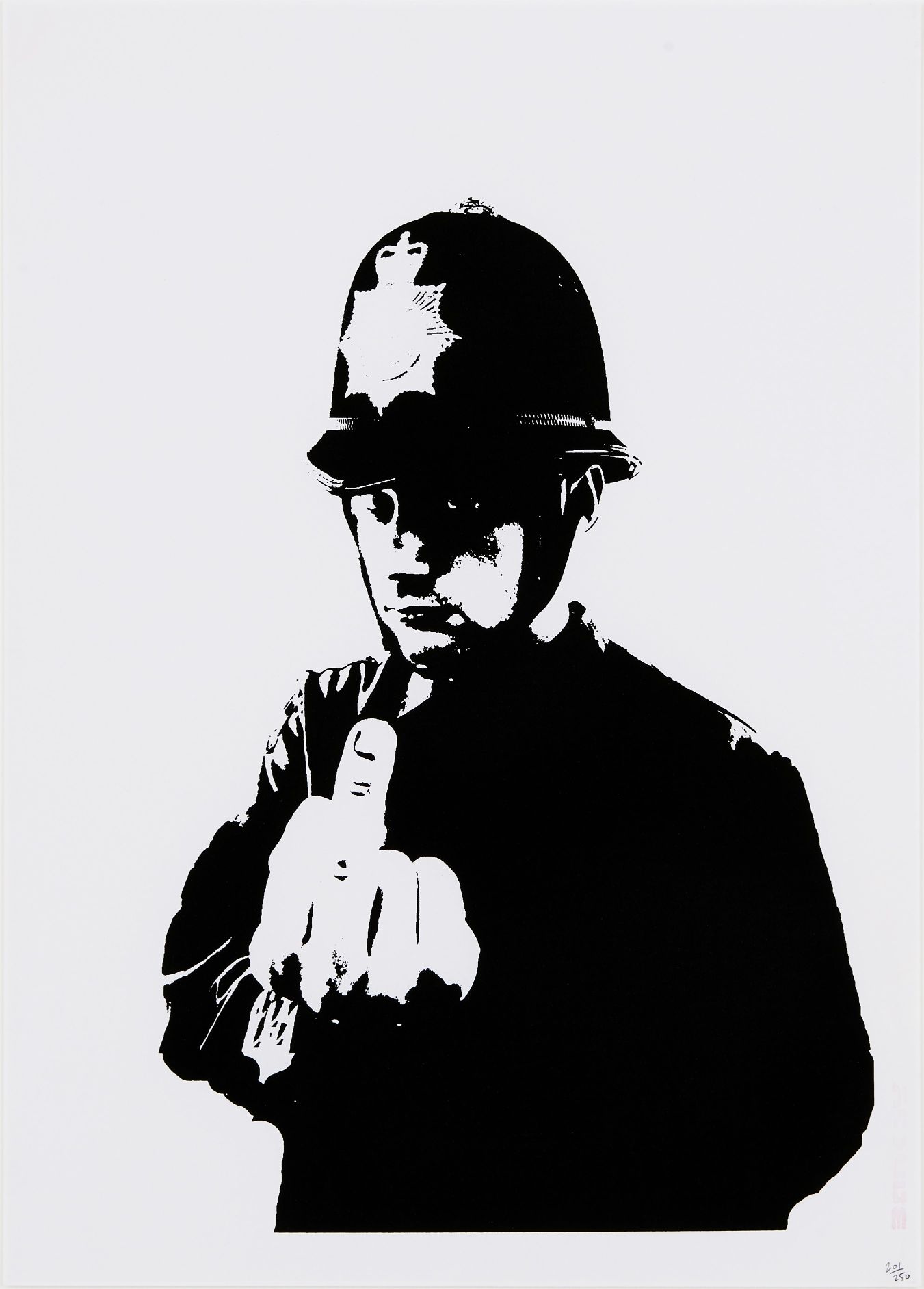 中指を突き立てて威嚇するロンドン警視庁の警官は2000年代初期の作品で、バンクシーの元マネージャーのスティーブ・ラザリデスのもとで制作された最初のシルクスクリーンによるプリント作品。モノクロのステンシルで、黒ずくめの制服から白抜きされた中指が効果的に立ち上がっている。警官が威嚇している相手は市民なのか、もしくは腐敗した国家機関そのものなのか。