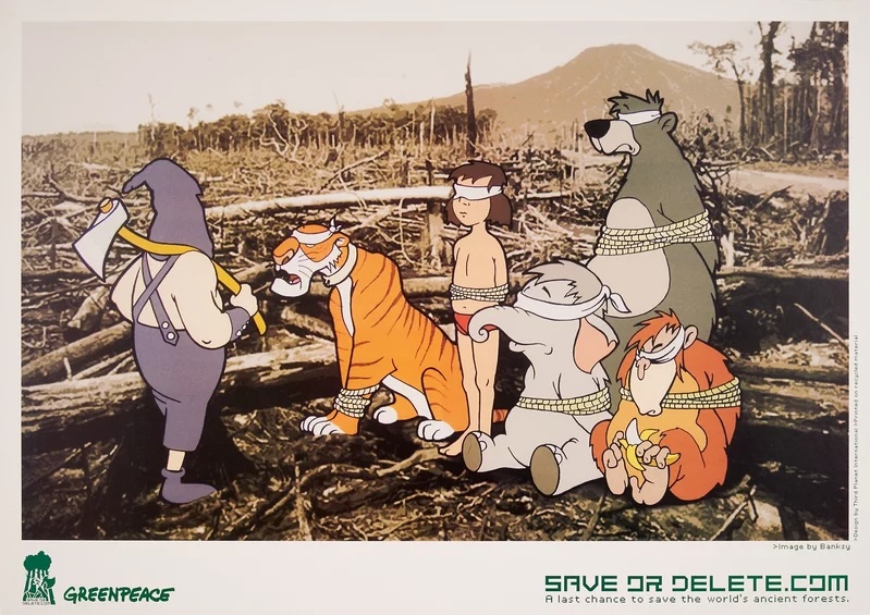 《Save or Delete》は、数あるバンクシー作品の中でも特に議論を呼んだもので、正式にアート市場に流通したことは一度もない。もとは2002年に非政府組織(NGO)のグリーンピースが「Save or Delete」キャンペーンの一環として制作を依頼したもので、世界規模で進む森林破壊の問題に社会の目を向けることが目的だった。バンクシーが描いたのは、ディズニーの1967年のアニメ映画『ジャングル・ブック』の主要キャラクターたちが、人間による濫用で荒廃した風景の中で人質になっている姿だ。当然ディズニーは訴訟を起こし、作品は流通することも、グリーンピースによって使用されることもなかった。