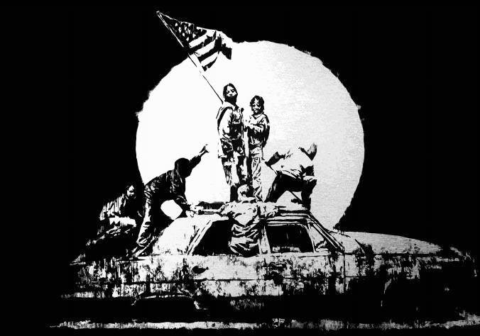 《Napalm》に続き、ピュリッツァー賞を受賞した有名な戦争写真をモチーフにした作品。今回使用されたのは、写真家ジョー・ローゼンタールが1945年2月に撮影した、硫黄島の制圧後、摺鉢山の頂上に星条旗を立てようとしている米海軍兵の写真だ。バンクシーは長年アメリカの勝利の象徴とみなされてきたこの写真の兵士たちを、みすぼらしい身なりのホームレスの若者に置き換えている。うち捨てられた自動車の上で勝ち誇ったように旗を揚げる貧しい若者の姿は、オリジナルの写真から60年を経たアメリカの現実を突きつけている。