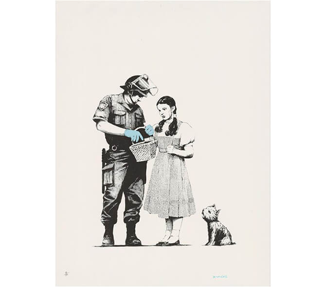 ロンドン警視庁の80年代当時の制服を着用した警察官が『オズの魔法使い』のドロシーに職務質問して、荷物検査を行っている。これは、80年代のイギリスで少数民族に対する人種差別的な対策を行うロンドン警視庁に対して、暴動やデモが起きていたことを風刺した作品。無邪気の象徴のような少女ドロシーでも容赦なく検査を行う不条理を問うている。